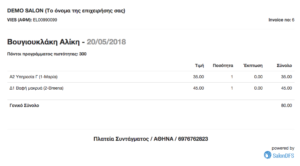 Στην ολοκλήρωση ραντεβού, στο κάτω μέρος, έχει την επιλογή “Εκτύπωση (Προεπισκόπηση)” όπου μπορείτε να δείτε το παραστατικό και “Εκτύπωση σε PDF” όπου μπορείτε να το κατεβάσετε σε αρχείο για να το σώσετε ή / και να το στείλετε με email στον πελάτη.